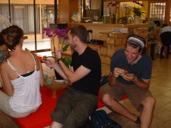 | 7月18日(水曜日) 昨夜アルベルトから電話が入ってきた。 「今別府に居る。明日広島に行くのだが本当に訪ねても良いか?」と言ってきた。 12時に広島駅というので、改札口で待っていると、嫁さん急にトイレに行って来ると言う。 コンチとアルベルトが間違って在来線の方に人込みと一緒に流れて行ったら分からなくなるのに・・・。 客も少なく早めに来たし、背が高いのですぐに分かった。 私はビデオを構えていたので彼らがすぐに見つけてくれるか?もし在来線に歩いて行けば、大声出さんといけんかな? と思っていたが、彼もすぐに私を見つけてくれた。 嫁さんはまだトイレから帰って来ない。「ヤーヤーよく来たね!」と日本語で言って握手。 「×○※×○※アイコ×○※」と言うので「トイレ!」と指差す。 ニコニコしている事3分間くらいでようやく嫁さん帰って来て、お互いにハグしている。 昼飯はまだだと言うので「お好み焼き」のお店に食べに行く。 矢賀新町にあるおばちゃん二人でやっている極普通のお店である。 外国人を連れて2〜3回行ったので、私達夫婦の事をちょっと覚えていてくれた。 「豚肉と卵は大丈夫?」と聞いて、そば入りお好み焼きを注文。 私が極普通のお好み焼き屋さんに連れて行くかというと、鉄板で食べさせてくれるからだ。 私が食べるのを見せながら。これが正式な食べ方だ!!と外国人にヘラを使わせて フーフー言わせながら食べさせるのが面白い。 彼らが一番驚くのは、目の前で料理してくれる事らしい。面白がって何枚も写真を撮っている。 コンチは熱いのが苦手らしく、だいぶ遅くなったがヘラで完食した。 スペインに帰ってお好み焼きを焼いてくれればと思い、製作過程はすべてビデオに撮った。広島を代表する郷土料理だ!! と言ったので、スペインでチャレンジしてくれると嬉しいが・・・・。 当然お好み焼きソースはお土産に持って帰らせる。 ![]() 昼飯が終わったので、半日の時間ならば原爆資料館だ。 広島に住んでいると分からないが、世界で一番有名な都市は「ヒロシマ」だろうと思う。 各国の首都は興味がないと答えられない。 アメリカはニューヨーク or ワシントン。 スペインはバルセロナorマドリッド。ドイツはベルリンorボン。 超有名国でも私にとってはちょっと考えてしまう。ましてやアフリカ諸国だと一国も分からない。 人類に始めて原爆を使用したと言う意味で、世界中の子供達は「ヒロシマ」を教えられている。 実際コロンビアやコスタリカやスペインやタイを旅行して、現地の人たちと話なしをする機会があって 「広島から来ました」というと全ての人達が「ヒロシマ」を知っていてくれた。 広島人として、外国人が我が家を訪ねてくれて時は、必ず原爆資料館へは連れて行く事にしている。 入館料は50円。英語やスペイン語などの外国語案内のテープは300円である。今回は私も一緒に入館した。 原爆の威力や、被害状況(焼け野原)もすごいと思うが、焼け爛れた三輪車や、弁当箱や服にはいつも泣かされる。 何町何丁目何番地の誰々さんの物ですという説明文である。 物だけの展示(瓦やガラス瓶)だと、さほどショックを受けないが、持ち主が確定されていると、 この服を着ていた子供が焼け死んだと思うと、やはり泣けてしまう。 この資料館を見た外国人達はどの様に感じてくれるのか・・・。 私は我が家の客人達にあーだ、こーだと説教は一切しない事にしている。 彼らが感じた通りを本国で周りの人々に話をしてくれれば良いと思っている。 原爆資料館の前半部は戦前の広島の町に賑わい紹介している。 そして軍都、軍港、大本営が置かれていた事も説明している。 広島が被害者面馬鹿利するなと言う批判に答える為だろう。 唯、アメリカが主張する「原爆を投下したお陰で、戦争が早く終わって日本人やアメリカ人の100万人の命が救われた」 とする考え方には、ヒロシマ人として、何とか理論武装しておきたいものだ。 久間防衛元大臣の失言「原爆投下は仕方なかった」と言う類の論理に対してもである。 石原東京都知事がテレビで面白い事を言っていた。 「自分はアメリカの飛行機に機銃掃射を受けた。町の中で一般市民を追いかけまわして アメリカ軍パイロットは面白がっていた。それは卑怯者のすることだ」とアメリカ人に自分の経験として話をすると 「それは申し訳なかった」と愛国主義者のアメリカ人も謝るそうだ。 原爆の何百倍もの水爆も作ってしまい、全人類を何度も殺せる量を作ってしまった、核保有国の国民に 是非この資料館を見てもらいたいものだ。 一発の水爆でひとつの都市を蒸発させる威力を持つ爆弾を使用してしまっては勝利者は何処にも 存在し得ないと思うのだが・・・。 コンチとアルベルトは学校の先生なのだ。テープ案内に従って一時間半程館内を巡ってくれた。 私達夫婦は長椅子で休んでいたが、お構い無しで熱心に見てくれた。 スペインに帰って子供達に「ヒロシマ」の事を伝えてくれ