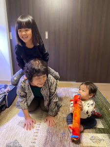 | 11月2日(土)長男宅へ 朝皆でバス停まで見送りに来てくれた。 ネットで調べた通りちゃんと乗り換えが出来て根岸駅に到着。 前回根岸駅前の「日高屋」のラーメンが安くて旨かったので 長男一家と待ち合わせて昼食。 出会ってバーバとのハグを、ひなこは自然にしていたが 樹は嫌がっている風!男の子だわい! 夜は3歳から習っているピアノをひなこが演奏してくれた。 両手両足を使って譜面も見ず、滞ることなく演奏し終わったので 休まずピアノ教室に行っているのだろう。 ひなこはバーバに複雑なバラの折り紙を1時間かけて教えていた。 自分たちは衰えて行くが孫たちはどんどん成長していく。 成長を目の当たりにするのが驚きと共に嬉しい限りだ。 |