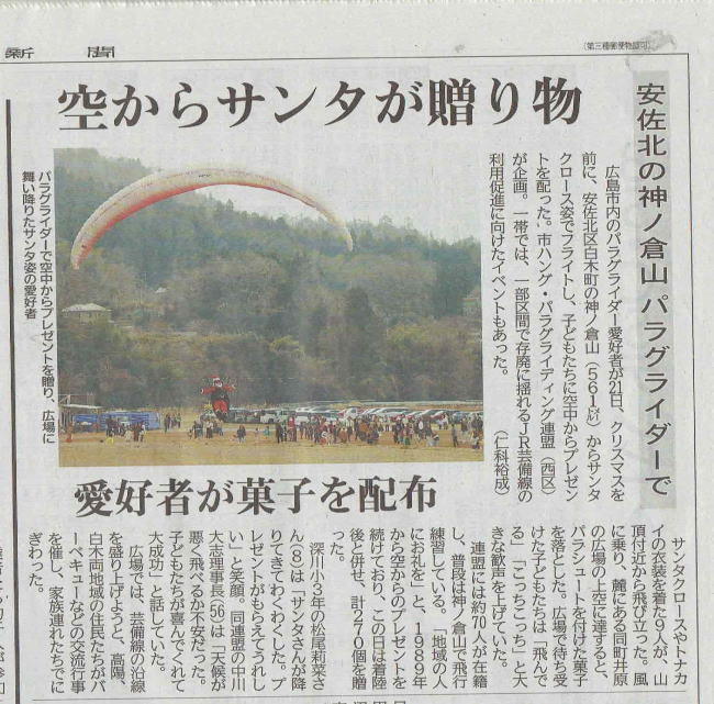 12月21日(日)サンタフライト ![]() サンタさん達 コマちゃん 毎年サンタの恰好をしてパラグライダーで空からお菓子を撒いている。 パラシュート付きのお菓子袋は子供たちの憧れである。 先輩たちのイベントを繋いで1989年から続いている。 地元の皆さんへの感謝の気持ちを込め毎年お菓子を配っている。 お孫さんたちも2代目3代目になったのかな・・・ 最近の地域起こしや芸備線復興の一助になれば望外の喜びである。 地元のマンホールの蓋にはハング・パラが絵が書かれているし 井原地区の紹介には必ずハング・パラがある。 地元の皆さんからは田んぼランディングの便宜をはかってもらったり 色々ご迷惑をお掛けしながらも暖かく応援して頂いている。 荒谷山には雲海を見物しようと大勢の人がテイクオフ場にやってくる。 禁煙の看板がこれでもかと立ててあったり、トイレ傍に水の入った 灰皿も用意してあるのに毎週20本ばかり吸い殻が落ちている。 「井原わくわくプロジェクト」の人たちも毎週清掃して頂いているのだが・・・ 「割れ窓理論」もある事だし本当に頑張っておられる。 我々も気が付けば吸い殻を拾うようにしているのだが・・・ 今年はテレビでも山火事のニュースを多く流している。 山火事を起こすとパラグライダーテイクオフの封鎖は必須となるだろう。 井原地区が広島のハング・パラの聖地として長く続くことを願うばかりである。 中国新聞にも記事に取り上げられた。 ![]() |