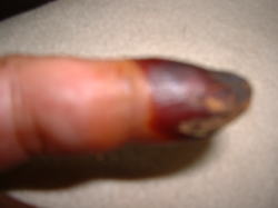 | 8月28日(金曜日) 手術前日の診察で皮膚移植の方法変更。 手のひらの皮膚が一番良いのだが、手のひらに3週間も人差し指をくっ付けておくと 関節が固まってしまう恐れがあると言われた。 「65歳の高齢なので関節が固まる恐れがあり、皮膚を移植して関節が動かなくなったのでは 本末転倒になりますので、中指の背中の皮膚をめくって人差し指の腹に移植します。 の皮膚をめくったところには足の付け根の皮膚を切り取って貼り付けます。 3週間して人差し指と中指を切り離します。」と言う説明を受ける。 人差し指の壊死している部分を紙に写して、中指の背中の皮膚で間に合うか検討。 明日の17時から手術しましょうと言う事になった。 BeforeとAfterの為写真を撮った。 黒く変色している所はカチカチでミイラ化していた。 第一関節は曲がらなかった。指先は少し細っている。 ![]() |