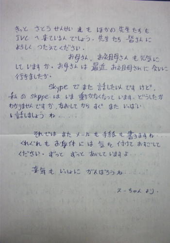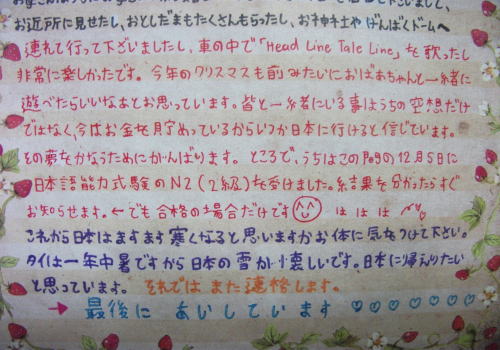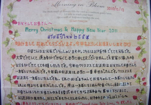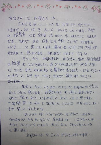 | 1月1日(土曜日)パッちゃんとスーちゃんの年賀状 タイのパッちゃんからの年賀状 日本語学科で学んでいるので尊敬語もちゃんと使えるようになってきた。 でも広島弁の手紙が懐かしい。 アルバイトして、私にシャツと嫁さんにストールとブラウスを送ってくれた。 1月1日には電話まで呉れた。(コンピューターが壊れているらしい) 今年大学3年生になるのだが、1月1日生まれなので22歳になったと嘆いていた。 ![]() ![]() スリランカのスーちゃんからも年賀状が届いた。 スーちゃんは大学入試の試験は受かったようである。 いつかは日本にも来たいと希望を膨らませている。 メールでスリランカに何時来るの?といつも聞いてくる。 スリランカにも入学のお祝いに行かないとなあ〜 ![]() ![]() やっぱり女の子は良いなあ いつまでも忘れずに手紙を呉れる。 コロンビアのホアンも節目の時は連絡を入れてくれる。 どんな人間に成長していくか楽しみな事だ。 |