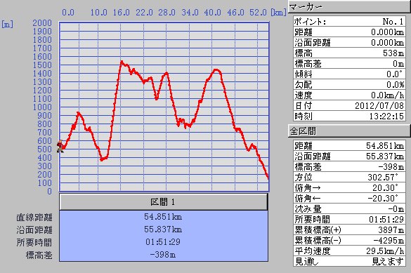 | 7月1日(日曜日)梅雨の晴れ間 私のHPは無料のところなので10MBしかもらってないので、あちこちリンクの張りまくりだ。 最近は無制限で広告の出ないところもあるので引っ越そうかと思っている。 すべてのHPを一まとめにしようとしたらリンクの張り替えをしなくてはならない。 整理し始めたのだが、まるでジャングルに入り込んだ有様だ。 本文の中のリンクを探し出して、統一したHP内のリンクに変えないといけない。 この3〜4日ジャングルをさまよっている。 一週間前の予報ではあまり良くなかったが、だんだん晴れ予報に変わって行った。 ついに、この日曜日は15時ごろからばっちり晴れ予報となった。 11時ごろには、神の倉の東屋に続々と皆さん集まってきた。 すでに神の倉TOにはハングの人たちがたくさん上がっている。 しばらく飛んでいないので、とりあえず一本は飛ぼうと立川さんたちを誘って神の倉TOへ。 久保ちゃんはレスキューパラのセットが未だなので、私の車の上げ下ろしを買って出てくれた。 神の倉TOでは、ハングが十機ばかり組みあがっている。 ハングは新人さんも増えているようで、パラと一緒に飛ばすのは遠慮しているようだ。 特に今の時期は同じLDを使うのでなおさらのことだ。 サーマル条件は良くないのが、とりあえずパラから先に飛ぶことにした。 TOは北寄りの風1〜2mの風、雲量50%くらい。 残念ながら皆ぶっ飛びであった。 2本目も是枝号で神の倉に上がる。 13時ごろハングのベテラン大田さんテイクオフし、サブラン近く?を探っていたがLDに戻っていった。 手練者の是枝さんテイクオフし、鉄塔下手前の尾根で小さなサーマルを引っ掛けトップアウトしていった。 テイクオフ上空に来て”早くテイクオフしたら!”とばかり誘っている。 立川さんテイクオフし、鉄塔下のだいぶ低いところで粘っていたがじわじわ揚げだした。 2〜3機テイクオフしてから、13時22分私もテイクオフ。 まっしぐらに鉄塔下に行く。葉っぱが揺れている山肌にぴったり寄せる。 寄せすぎて荒れてはいるが何とかしがみ付き、何とか海抜930mまであがった。 神の倉山頂上空でサーマルはずしたようなので沖に出す。 サーマルが上って行った後の空域で高度が下がる一方。 うろうろ探してみるも何もなく、海抜367m(地上224m)間で下がってしまった。 人家が密集していて、屋根から立ち上るであろうサーマルの流れてくるあたりを探ってみる。 おお!!あったぞ! 3〜5m/Secの良いサーマルにしがみ付き海抜1550mまで一気に上がった。 高度差1360mを7分で上がっているいるので、秒速3.3mで上がったことになる。 ほとんど雲底で視界がぼんやりしだした。 先ほどこのサーマル上がってきたものが他に3名いたはず・・ 3名共もう少し沖にいた筈だが、やはり見えないと不安なので雲から逃げる。 先ほど雲底に着いた時ビデオカメラをセットし忘れていたので、電源を入れヘルメットに装着。 後から再生してみると雲底がしっかり写っていた。 ねずみ色の雲の下を移動する。 結構寒くなってきた。地上では汗が噴出すフライトスーツを着込んでいて良かった。 志和口駅上空近くまで移動したら海抜1090m間で下がったが、 雲の吸い上げに出会って海抜1400mまで持ち直した。 神の倉山頂へ戻って行くと海抜770mまで下がった。 鉄塔下ボウル上空を探っていると2〜3m/Secのサーマルヒットし 雲底に近くなると雲の吸い上げで緩やかに上がり海抜1450mまで上がった。 北の鉄塔に雲があるのでとりあえず行ってみよう。 沖で足刈さんが並行して走っている。 下がる一方でサーマルに出会わない。 もう北の鉄塔を取るのが目的化してしまった。 海抜841mでターン。 メインランディングまでもどれるか心配なので、アクセルを踏み込む。 神の倉TOにトップランできるか窺う。(高度不足で無理!) そのままメインランディングに降り立つ。 最高到達高度は海抜1550m、フライト時間1時間50分であった。 梅雨の中休みとしては上出来のフライトだった。 グーグルアースのデータ inagaki_12_7_8..kml カシミールのデータ 12_7_8_inagaki.zip ![]() |