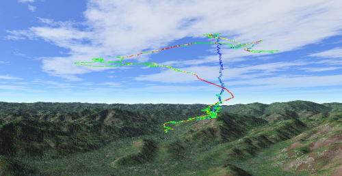 | 5月25日(水曜日)平日飛び 来週土日は天気悪い予報で、25日はあまりに良さそうなので、平日飛び敢行となった。 朝一仕事を済ませ11:30神の倉集合。 神の倉の風は北2〜3m、荒谷山は南東が中心だが、弱くてくるくる変わっている。 ランディングは北5m前後である。悩んだ挙句荒谷山へ。 河原さんはキャノピー積み込むのを忘れたので、彼を残して、石井さんと私とでテイクオフ。 何事も無くハングハウスに降ろす。 キャノピー取りに下山した河原さんと、遅れて来た中村さんとで荒谷山へ上がり、 30分位ウエイティングしていたが、テイクオフ。 マキゴンポイントの少し上で、二人共上げ、一気に+1700mに上がってしまった。 遅れて来た竹井さんと石井さんと私と見学者2名とで、神の倉に上がる。 3時頃、今まで北がらみであたのが、南に変化し始めた。時々強いブローも入ってくる。 ブローのパワーを計ろうと立ち上げたら、そのまま浮かされたので、テイクオフ。 3度ばかりテイクオフ前をウロウロしたが、トップアウトしそうにないので、5分間でとりあえずトップラン。 しばらく様子を見て、ブローが入り始めたので立ち上げる。 一歩も走らず浮かされ、右尾根で廻して+200m上がった。 テイクオフ上空をウロウロして、レベル近くまで下がって、もう一度右尾根でヒットし、 鉄塔上で真上に一直線に上がっていった。 (平日ログ参照) カシミールで見ても、海抜1000mから2000mまでは、半径40m以内で、真上に上がっている。 GPSを使用し始めて初めての経験だ。 川地塾の成果だと云いたいところだが、腕ではなく、余程条件が良かったのだ。 雲底が海抜2100mくらいで、1900m位からは、雲の吸い上げだったのか? サーマルと吸い上げの境界も分からないくらいにスムーズに雲にスポンと入ってしまった。 誰も居ないし、+4m位で安定して上がるので、そのまま廻し続ける。 寒い!!! フライトスーツは着てるのだが、シャツは腕まくりをしているので、腕が痛くなり始めた。 5分もすると不安になるので、北に向けて直進させる。 バンクかけて廻している時は何とも無いのだが、直進させて少しでも揺らされると、上下左右が不安になる。 早く雲から出たいと思うと、10秒間も長く感じる。雲を抜け下界が見えるとほっとする。 しばらくこの雲(直径1.5Km、厚み300m) の下で遊ぶ。 雲底にコバンザメのごとく貼り付いて、雲の流れに従って動こうと思うのだが この雲全然動いてくれない。日陰も寒いので、雲底を離脱。 荒谷山方向を目指す。緊急ラン上空海抜1700m位でほとんど高度を下げない。 学生(てぃん)が安駄山を目指し、あまり高度ロスしないで、山頂に付けた。 私も行きたかったが、夕方会社に帰って一仕事残っているので、クロカンは自重する。 学生(てぃん)はこちらに向けて帰って来る。海抜1000m位は南風の様で 結構早く帰って来ているので、MLはOKだろう。 もう一機神の倉裏の八幡谷の山を頑張っている学生(ぐっちょん)がいる。 私の高度1500m位からの観察だと、えらく低く見え、神の倉テイクオフを超えてMLに届かない様に見えた。 どこにアウトランするのか確認して・・・と思っていると、神の倉を越えてMLを目指している。 時間も迫っているので翼端折って降下を始める。一気に神の倉テイクオフまで下がる。 3度ばかりトップラン狙ったが、南南西が強く当っていて、何度も吹き上げられる。 時間もないので、MLへ。電話が入った。 本日のフライトを皆さんと話をする間もなく大急ぎで帰社。 ![]() 神の倉鉄塔上から真上に一直線に上がった。 |