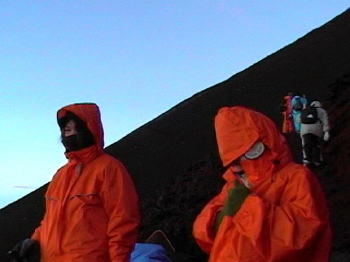 8月13日(土曜日) ![]() 朝8時富士駅で下車。 観光バス仕様のりっぱなバスで河口湖へ向け出発。ところが、ウインカーの調子が悪いらしく バスを交換するとの事。インターチェンジの駐車場で乗り換え。 乗り換えたバスは通勤バスであった。ちょっと先が思いやられる。 河口湖駅で富士山五合目行きのバスに乗り換え。五合目までの道路はマイカー規制をしており バスしか走ってなく、渋滞なしでスイスイ五合目に12:00到着。 ![]() 13:00登山開始。 15分ばかりトラバースして、上に登り始める登山口。ここで、学生建7名 ばかりのグループに 写真撮影を嫁さんが頼まれた。撮影をしていると、パッちゃんが「タイ人みたい!」とグループで ただひとりの女性を見て話し掛けた。 果たして、タイ人で、今年4月から日本の大学に留学している。チェンマイ出身の美人学生であった。 パッちゃんも久しぶりにタイ語が話せるので、喜んでいた。 ![]() 私たちは7合目までなので、先に行ってもらった。というか、彼らには付いて行けなかった。 パッちゃんは盛んに「寒い!寒い!」と言っていた。 いきなり2300mの高地に来たので半そで姿では寒いに決まっている。 長袖を着なさい!と言うのだが、「いい!いい!」とおしゃれの方が気になるパッちゃんである。 下の方から雲が湧いて来たかな?と思っていると、雨が降り出し、雷もなり始めた。 あわてて長袖や、雨合羽を着させる。 2500mを越えるとパッちゃんはへたばってしまい、10分間ばかり登っては、座り込む始末。 励まし励まし6合目の最初の山小屋に到着。「お腹空いた!!」と言う。 そう言えば5合目では、あまりに人が多かったので、昼食を食べるのを忘れた。 雨も降っているし大休止には良かろうと、ラーメンを注文。即席ラーメン 600円であった。これからは一合あがる毎に高くなるのだろう。 パッちゃんは余程お腹が空いていたと見えて、2杯も食べた。 ![]() パッちゃんの様子を見て山小屋のオヤジにとうてい白雲荘に到着しないと脅かされる。 確かに今のペースだと夕方7時頃になるかもしれない。パッちゃんはタイの家族や 友人達に富士山に登った!!と言いたい一心で、下山するとは言わない。 「パッちゃんは山に登ったことあるの?」「うん!5分間登った!」「5分間は山でなく坂道でしょう!」 こんなやりとりで先が思いやられる。 いつ下山の決意をするか?見極めながらの登山である。10分ばかり登っては 「5分!5分」と言って倒れ込んで休息を哀願するパッちゃんである。 ようやく7合目と書いてある山小屋に到着。次の山小屋に到着しても、本7合目である。 パッちゃんは「心が痛い!」と言い出した。高山病で、心拍数も上がっているようだ。 深呼吸を何度もさせ様とするのだが、2〜3回でやめてしまう。 とにかく深呼吸で酸素を取り入れるしかないのだが・・・。 酸素ボンベや酸素水や食べる酸素を買って来ているのだが、あまり役に立たないようだ。 劇的に効果があるわけはない。 ゆっくりでも一歩一歩前進し続けてくれると良いのだが、5〜10分歩くと「5分!5分!」と 言って倒れこむ。すでに17 時を廻っているのだが、白雲荘(3200m)は見えない。 小雨状態で降り続いている。 ![]() 救いはバスツアーの中高年組がガイドの指導により、ゆっくりしたペースで 登ってくれているので、彼らと同歩調ならと思うのだが・・・・。 小雨がやみ、夕闇のかなたに白雲荘の文字が見えた。 パッちゃんをはげまし、はげまし、一時間かかってやっと18:30に白雲荘に到着。 雨合羽はビニール袋に入れ、濡れたザックは廊下に 並べたらしかられる。4畳に6名寝るのである。布団は3人用が2組敷いてあるだけ。 6名が肩を並べて寝るわけにはいかない。一人置きに足と頭を逆さ方向に寝るのだ。 食事です!というので晩飯に食堂へ。カレーライスであった。朝食ですと、弁当を渡される。 疲れ果てているので、すぐに布団へ。寝返りどころか、微動だに出来ない。 足を伸ばすと嫁さんとパッちゃんの顔を蹴ってしまった。 足を伸ばしきれないで寝ていると足がけいれんを起こしてしまった。 思わず「痛い!!」と叫んで起きてしまった。もんでも良くならない。 反対側の足もけいれんを起こしてきた。 酸素供給とばかり、深呼吸を10回ばかり繰り返すと、あら不思議!痛みが和らいでいく。 一時間ばかり、間歇的に痛くなったが、深呼吸を繰り返し、しのぐ。 |