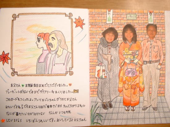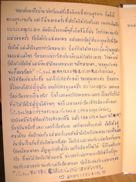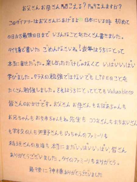 4月22日記す 私の誕生日(4月16日)に合わせてバースデイカードがぱっちゃんから届いた。 毎晩MNSの電話で話しているのだが、バースデイカードは秘密にしていた。(嫁さんは知っていたようだが) バースデイカードと日記帳が送られてきた。 私達には、娘が居ないので、ぱっちゃんが本当の娘みたいな気がしている。 ぱっちゃんは少ない日本語のボキャブラリーで、心のひだや哲学的なことを上手に表現できた。 頭がよく文才もきっとあると思ったので、大学に入ったら日本の留学生活の小説を書くように勧めた。 手始めに、留学生日記を、高校生活が始まる前に書くように強く勧めた。 電話の度に、日記書いた?と尋ねていた。 そしてついにバースデイカードといっしょに日記帳は送られてきた!! 150ページからなる留学生日記であった。20日ばかりで書き上げたらしい! 残念ながら、タイ語で書かれているので私には読めないが、きっと小説の原稿になると信じている。 電話の度に、会いたい!会いたい!と言ってくるぱっちゃんに根負けして、 来年会いに行くことを約束してしまった。(大学入学のお祝いに行こうと思っていたのだが・・・) ![]() ぱっちゃんが我が家に来たとき、赤毛のアンとマシューのようだなと思い、 「赤毛のアン」のアニメーションを借りてきていっしょに見た。 ![]() 日記帳の見開き ![]() ぱっちゃんが日本で撮り貯めた私達との写真で作ったアルバムの見開き。 ![]() こんな感じで、150ページも日記帳を書いてくれた。(これはそのうちの1ページ。) 私がぱっちゃんに話した重要なことは全て理解し、少ないボキャブラリーで的確に表現している。 タイ語が分かると嬉しいのだが・・・・ |